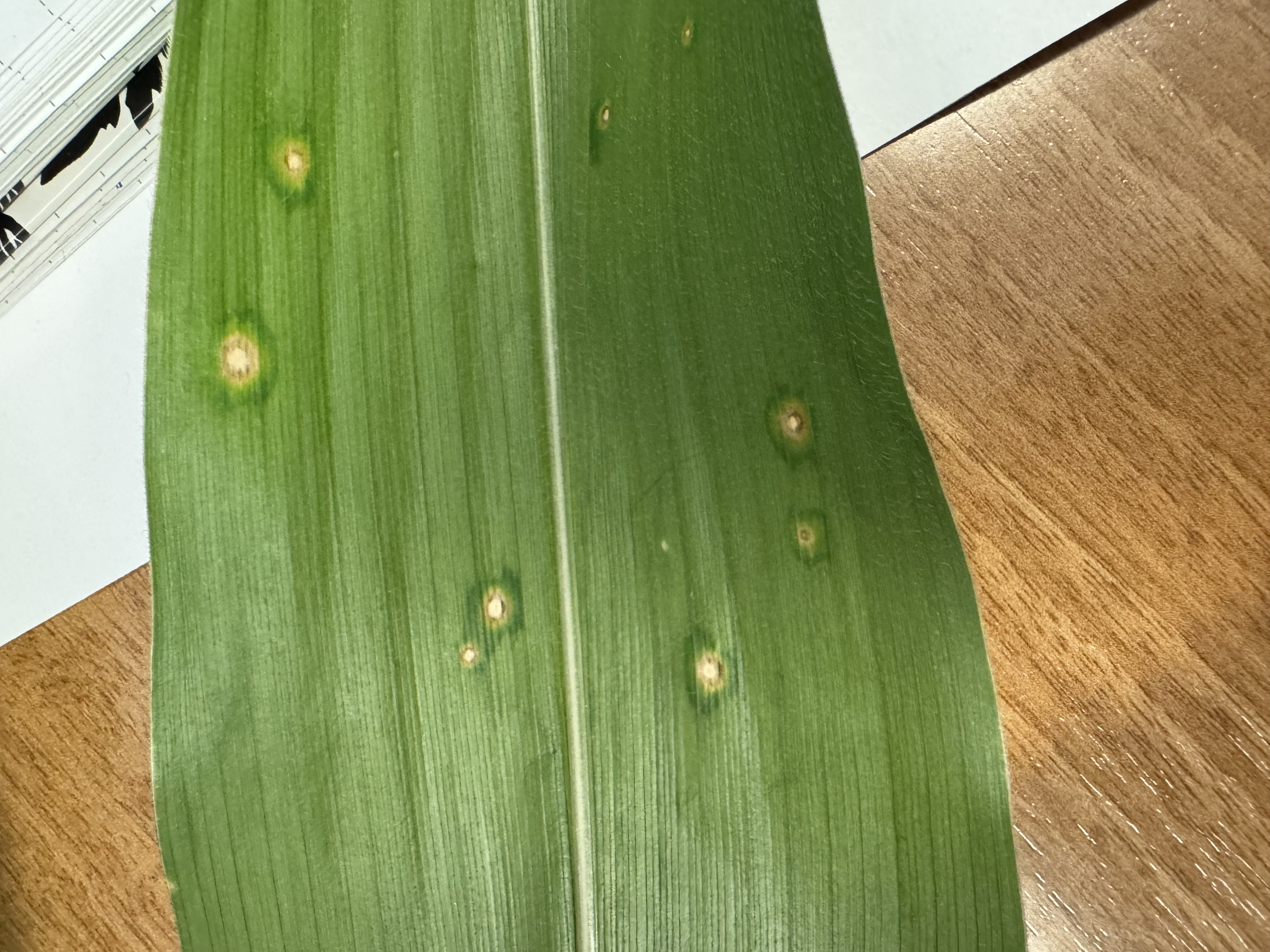 Holcus leaf spot is often mistaken for:- Contact herbicide injury, especially from products like paraquat (Figure 3). Herbicide injury typically appears uniformly on leaves at the same growth stage, and new leaves are unaffected. Look for a gradient of symptoms across the field; if symptoms fade from the edge inward or nearby non-corn plants are also affected, herbicide drift is more likely.
